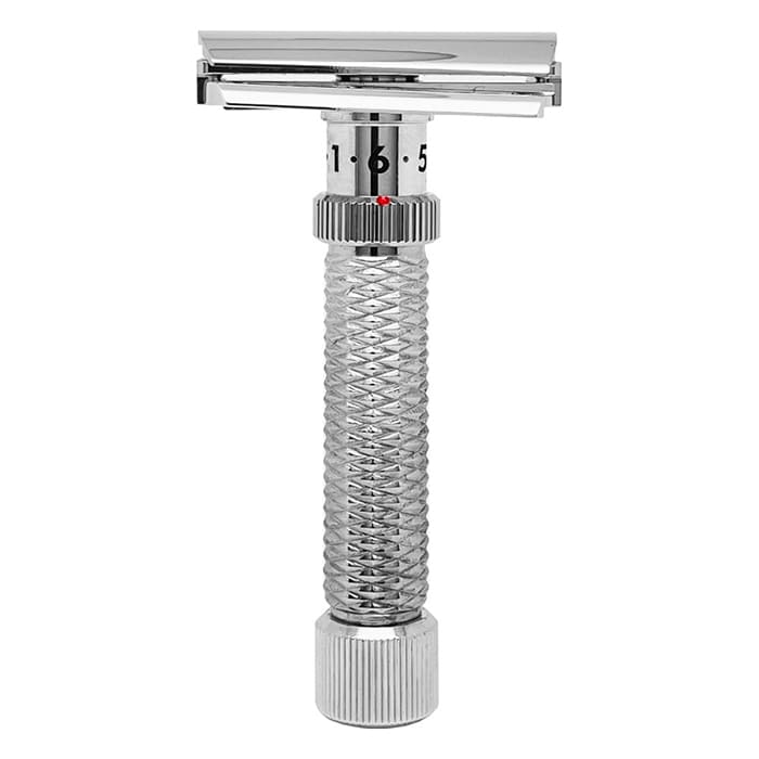 Ρυθμιζόμενο slant ξυράφι ασφαλείας από ανοξείδωτο ατσάλι ναυτικού βαθμού με φινίρισμα rhodium και λαβή diamond-grip. Απεριόριστη ρύθμιση έκθεσης λεπίδας, συμβατό με όλες τις λεπίδες — ιδανικό για σκληρό γένι και ευαίσθητ
