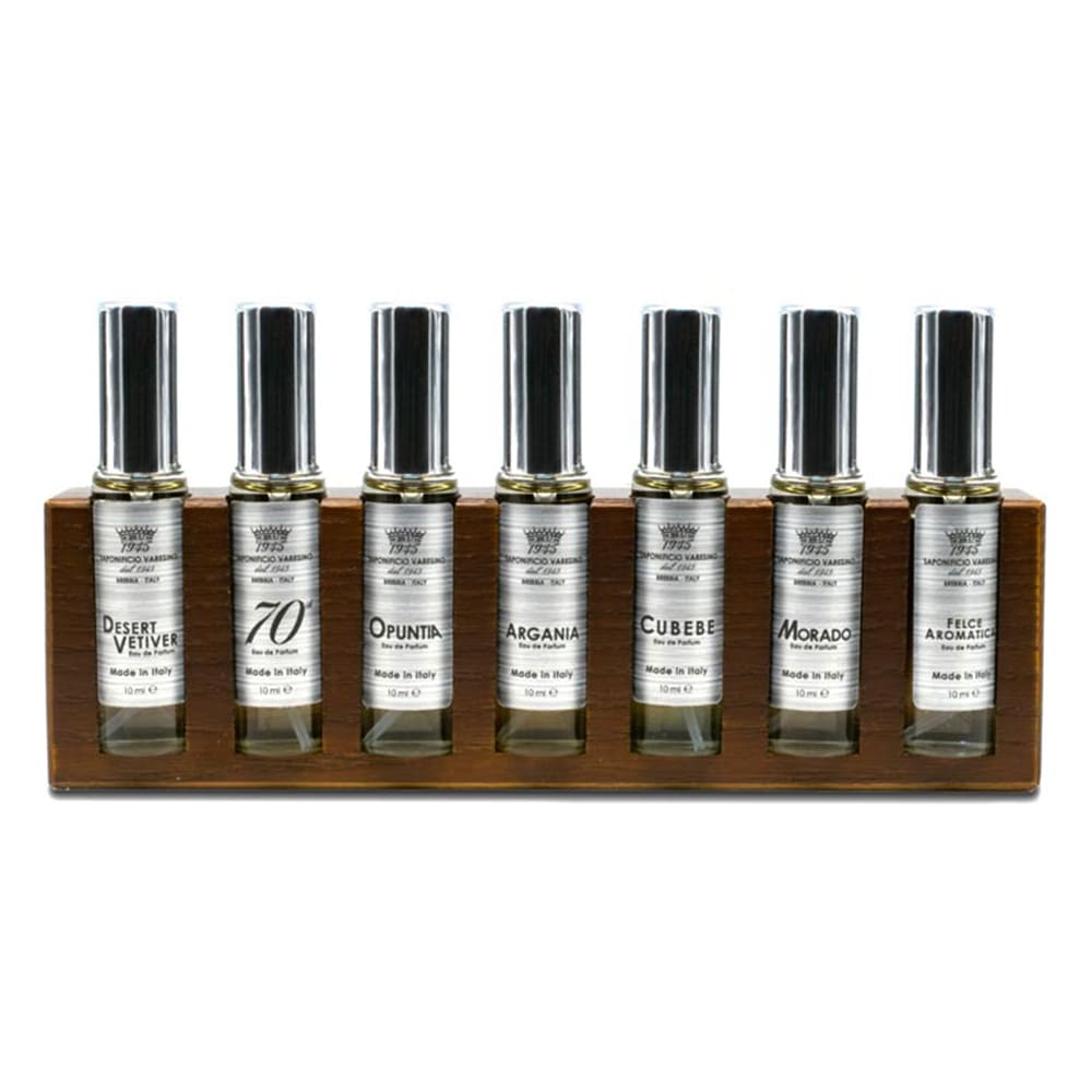 Σετ συλλογής 7×10ml eau de parfum με ψεκαστήρα σε κάθε φιαλίδιο, κομψή θήκη με ασημένιες εκτυπώσεις και βάση από ξύλο φράξου. Made in Italy — ιδανικό ταξιδιωτικό σετ και δώρο.