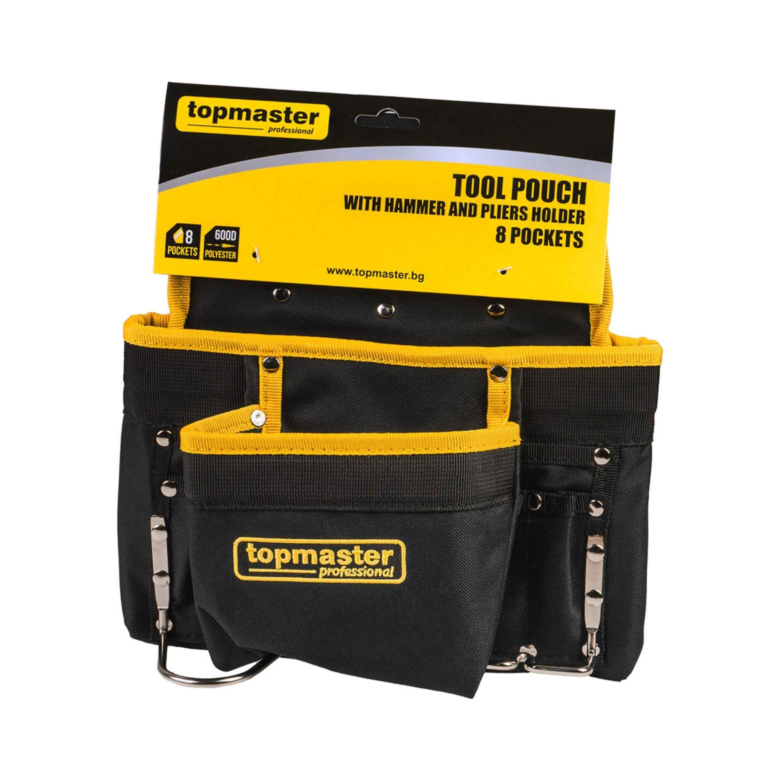Η θήκη μέσης εργαλείων TOP MASTER 499968 είναι κατασκευασμένη από ανθεκτικό πολυεστέρα και προσφέρει οργανωμένη αποθήκευση για διάφορα εργαλεία. Διαθέτει θήκες σε διαφορετικά μεγέθη, ιδανικές για κατσαβίδια, πένσες, μαχαίρια, κλειδιά και άλλα απαραίτητα εργαλεία. Η μεταλλική βάση εξασφαλίζει σταθερή στήριξη του σφυριού, ενώ η ειδικά σχεδιασμένη θέση για τις πένσες αποτρέπει την πτώση τους και επιτρέπει εύκολη πρόσβαση.